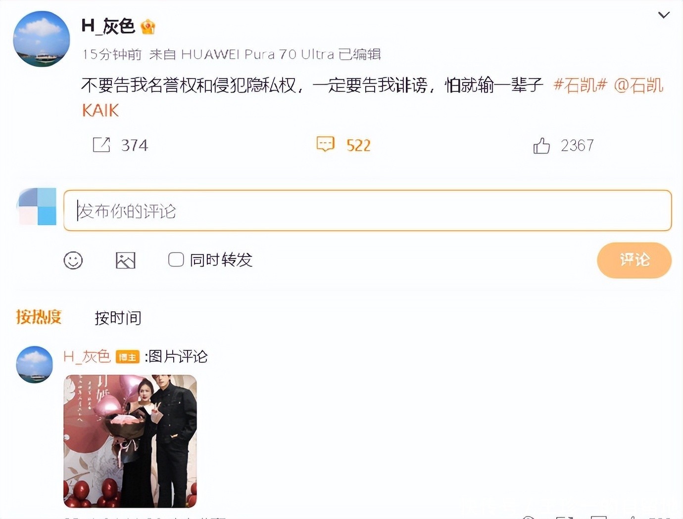 她还喊话石凯“不要告我名誉权和侵扰阴私权,一定要告我降低,怕就输一辈子。”